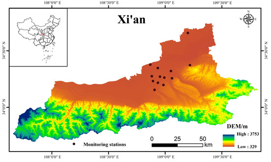 The air pollution data, including PM2.5 and PM10, came from the China Air Quality Online Monitoring and Analysis Platform (https://www.aqistudy.cn/) (accessed on 15 May 2022) monitoring stations. Data from 1 March 2019 to 28 February 2022 were used in the analysis. There are 13 automatic monitoring stations for environmental air quality at the China Environmental Monitoring Station in Xi’an City, including the High-Voltage Switch Plant, Xingqing Community, Fangzhicheng, Xiaozhai, People’s Stadium, High-tech West District, Economic Development Zone, Chang’an District, Yanliang District, Lintong District, Caotan, Qujiang Cultural Industry Group, and Guangyuntan Station. We used the hourly monitoring average values of all stations. Missing values have been removed. The presence of some missing values has little impact on the results. Meteorological data for the backward trajectory model came from the re-analysis data of Global Data Assimilation System (GDAS) provided by United States National Centers for Environmental Prediction (https://www.weather.gov/ncep/) (accessed on 10 June 2022). The spatial resolution is 1° × 1°, and the height is divided into 23 layers, including air pressure and horizontal and vertical wind speed.