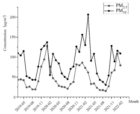 Monthly average concentrations of PM2.5 and PM10 from 2019 to 2022.