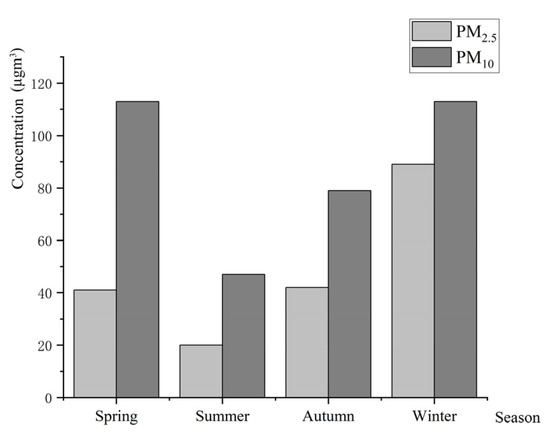 Average concentrations of PM2.5 and PM10 in the four seasons from 2019 to 2022.