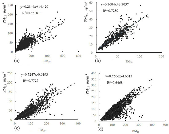Linear fitting of the relationship between PM10 and PM2.5 mass concentration in Xi’an with different seasons, spring (a), summer (b), autumn (c) and winter (d).