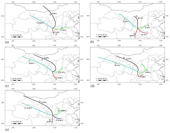 Clustering of annual and seasonal trajectories in Xi’an, with different periods, spring (a), summer (b), autumn (c), winter (d) and all year (e).