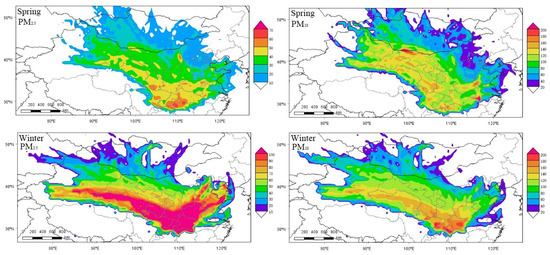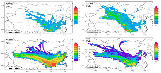 The potential source areas of particulate pollution in winter in Xi’an City are larger than in the spring. The potential source areas of PM2.5 in winter are the largest, covering eastern Sichuan Province, central and western Hubei Province, northern Hunan Province, Shaanxi Province, and central and southern Shanxi Province. The potential source areas of PM10 are small and mainly distributed in the southeast of Chongqing City and its junction with Hubei Province. In spring, the potential source areas of particulate matter are distributed around Xi’an City and neighboring provinces and cities. Chongqing City and northern Hunan Province are the main potential source areas of PM2.5. The potential source areas of PM10 are scattered in northern Gansu Province and northeastern Qinghai Province.