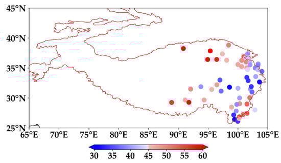 The climatological spatial distribution of the SH at 58 stations over the central and eastern TP is shown in Figure 1. The average value of SH at these stations is about 44.20 W m−2, which basically agreed with previously obtained results [,,]. In space, the SH over the northern TP (north of 35° N) is larger, with an average value of 47.22 W m−2, and the SH over the eastern TP (east of 98° E) is relatively smaller, with an average value of 42.26 W m−2, which shows a similar spatial distribution to those in previous studies [].