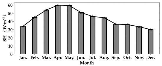 Figure 2 shows the annual cycle of the TP SH. The SH is positive throughout the year, showing a single peak with the maximum value of about 59.88 W m−2 in April, and then decreasing gradually, with only 30.01 W m−2 in December. Clearly, the SH in spring is the strongest for the whole year. As a transition season from winter to summer, spring is not only the time when the TP changes from a cold source to a heat source, but the stage of seasonal mutation of atmospheric circulation also changes []. Therefore, the SSH is very important and can play a prominent role in multi-scale changes.