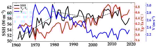 According to the calculation of SH (Equation (1)), the temperature difference between ground and air (Tg-Ta) and the wind speed at the height of 10 m (V10) are the key influencing factors of SH, so the variations in these two variables may explain the change in the SH trend. During the first period (1961–1979), the V10 represents a similar increasing trend to the SSH, while Tg-Ta shows strong interannual variations, without an obvious trend. Thus, the V10 is considered as the dominant factor leading to the upward trend of SSH. Similarly, the decreasing V10 is also responsible for the weakening trend in SSH in Stage II. However, it is clear that the increasing Tg-Ta accounts for the strengthening trend in SSH in Stage III. These findings further verify the results of previous studies [,,,]. Additionally, some studies also demonstrated that the turning point of SH occurring around 2000 is not an independent phenomenon, but is related to the adjustment of the global climate system [,].
