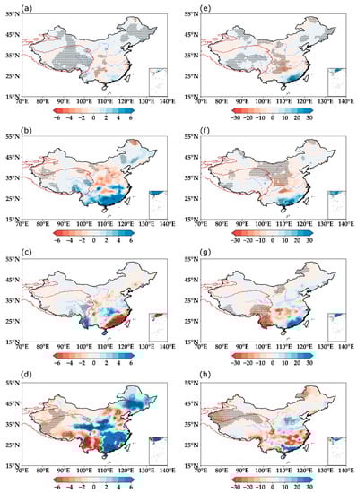 First, in Figure 4a, we can see the linear trend in SPR during the entire time period of 1961–2014. The spatial distribution of the SPR trend shows an east-west tripole pattern. The significant increasing trend of SPR is mainly distributed over northeastern China and the TP region, and the obvious decreasing trend of SPR is located in central China and the lower reaches of the Yangtze River, which is consistent with the results of previous research []. For the southern China, the SPR here shows an increasing, but weak, trend. The pattern of the regressed SPR on the TP SSH (Figure 4e) seems basically similar to that of the SPR trend, but with more significant signals over southern China, indicating that the SSH over the TP can affect the SPR in China to a great extent, especially for the TP region, central China, and southern China.