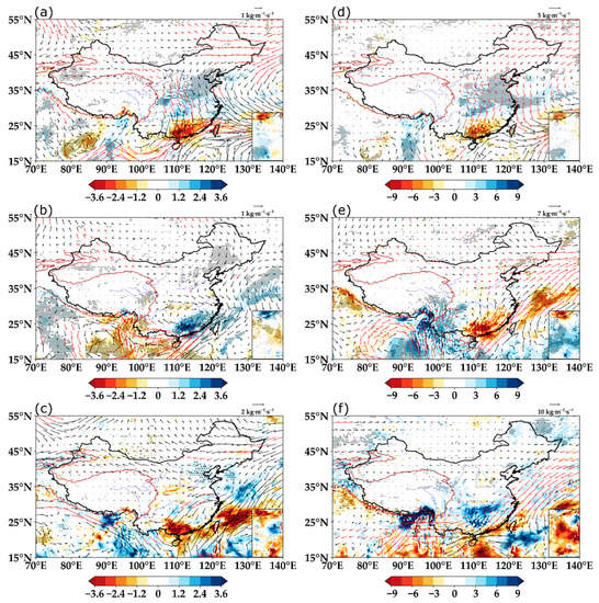 (a–c) Linear trend and (d–f) regression coefficients on SSH (W m−2) over the TP of integrated water vapor flux (arrow, 101 kg·m−1·s−1) and vapor flux divergence (shaded, 10−6 kg·m−2·s−1) of the whole layer (a,d) in Stage I (1961–1979), (b,e) Stage II (1980–2002), and (c,f) Stage III (2003–2014). Trends and regression coefficients with statistical significance above the 90% level are plotted as red arrows and dark dots.