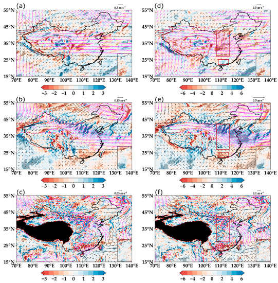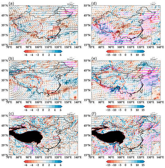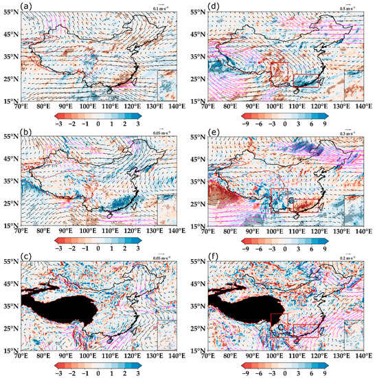 (a–c) The linear trend and (d–f) the regression coefficients on SSH (W m−2) over the TP of the wind vectors (arrow, m·s−1) and the divergence (shaded, 10−7 s−1) in spring (a,d) at 200 hPa in Stage I (1961–1979); (b,e) as in (a,d), but for the wind vectors and vertical motion (shaded, 10−3 Pa·s−1) at 500 hPa; (c,f) as in (a,d), but for 850 hPa. Trends and regression coefficients with statistical significance above the 90% level are plotted as purple arrows and dark dots.