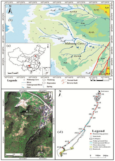 (a) Schematic diagram of the location of Shuanghe Cave in Guizhou Province, China, (b) hydrological sketch of the study area (Revised from references [39]), (c) map location of Mahuang Cave, and (d) Mahuang Cave Plan and distribution of monitoring points.