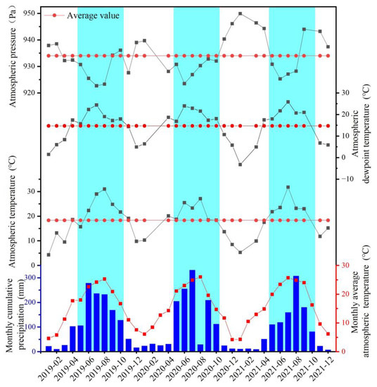 Atmospheric environment parameters in the study area. The range of atmospheric pressure, dewpoint, and temperature outside the cave was 923 to 950 Pa, −3.22 to 25.82 °C, and 4.3 to 31.8 °C, with an average value of 934 Pa, 14.69 °C, and 18.32 °C, respectively; n = 32 months. The monthly atmospheric precipitation and temperature ranged from 7.5 to 331.2 mm and 4.2 to 26 °C, with an average value of 103.9 mm and 15.7 °C, respectively; n = 36 months. The cyan bars indicate that precipitation is mainly concentrated from May to October each year.