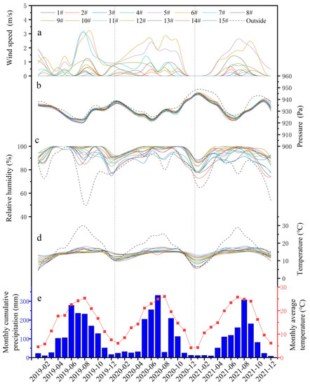 According to the development direction, cave structure, ventilation, and sediment landscape of Mahuang Cave, 15 monitoring points were set up (Figure 1). The inside and outside of the cave were monitored monthly by manual readings from January 2019 to December 2021. To ensure comparative accuracy, the monitoring time was fixed on the same day or adjacent dates in the middle and second half of each month, and the times of entrance and exit were 10:30 and 14:30, respectively, on the same day. February and March 2020 and February and October 2021 were affected by the COVID-19 outbreak prevention and control. Because the data were not monitored and sampled, lines were used to connect the samples when the data were added to the figures. For encrypted monitoring, we collected data with 1 min time intervals on 17 August 2019 at 12:00 to 22 August 2019 at 12:00 (warm season) and on 28 December 2019 at 12:00 to 2 January 2020 at 12:00 (cold season). No rainfall occurred before or after the monitoring. The temperature and relative humidity of the cave were measured using a Telaire-7001 portable infrared meter (Telaire Corporation, Goleta, CA, USA) and an external HOBO data logger (Onset Computer Corporation, Cape Cod, MA, USA). The wind speed, temperature, relative humidity, air pressure, and altitude inside and outside the cave were monitored in real-time using the American Kestrel-4500 portable weather station at resolutions of 0.1 m/s, 0.1 °C, 0.1%, 0.1 kPa, and 1 m, and accuracies of ±3%, ±1.0 °C, ±3%, ±0.15 kPa (25 °C), and ±15 m, respectively. The monitoring order was from outside to inside to avoid human influence and ensure measurement accuracy. The distance between the instrument and the researcher was maintained at >3 m during the operation. Meteorological data, such as temperature and precipitation data, were downloaded from the China Meteorological Data Network at the Tongzi County Meteorological Observatory, which is the closest to the Shuanghe Cave National Geopark.