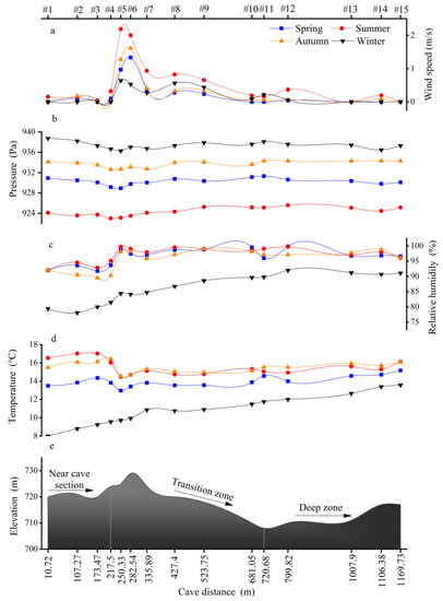 The cave pressure at the near-cave section (small slight decrease), transition zone (fluctuating slight increase), and deep zone (tending to stabilize) had little overall variation. It was at constant pressure (Figure 4b). Among them, transition zones #5 and #6 had the lowest relative pressure values, opposite to the highest relative altitude (Table 1, Figure 4e). The overall spatial variation in air pressure in the cave varied weakly with the depth and degree of cave closure.
