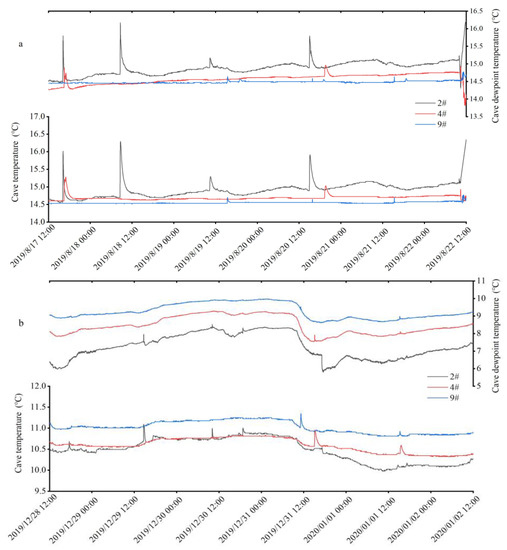 During the warm season (Figure 5a), the ranges of cave air temperature variation at monitoring points #2, #4, and #9 were 14.55 to 16.35 °C, 14.6 to 15.29 °C, and 14.51 to 14.8 °C, respectively, indicating that the closer to the cave entrance, the higher the cave temperature. Their dewpoint variation ranges were 14.28 to 16.21 °C, 13.8 to 14.96 °C, and 14.43 to 14.8 °C, respectively, with little variation.