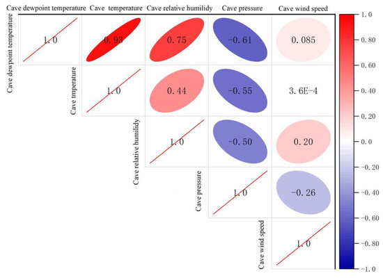 The analysis of the Pearson correlation heatmap (Figure 6) for dewpoint, air temperature, relative humidity, pressure, and wind speed at 15 monitoring points in Mahuang Cave from 2019 to 2021 showed that all elements passed the significance test (p < 0.01), except for cave temperature and wind speed, which had no correlation (r = 0, p = 0.994 > 0.05).