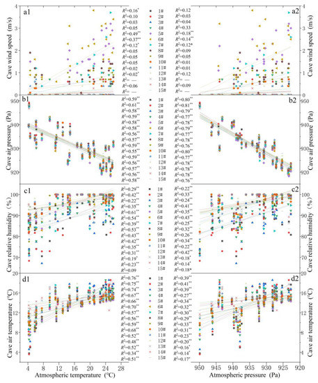 Cave air pressure was negatively correlated with atmospheric temperature (Figure 7b1) (R2 = 0.55 to R2 = 0.61). Generally, the atmospheric pressure decreases as the temperature rises and also drops as elevation rises. Due to the fact that the pressure inside the cave is a function of the pressure outside the cave and that a change in the pressure outside the cave should be quickly reflected in the environment inside the cave, there was a substantial and positive correlation between cave air pressure and atmospheric pressure (R2 = 0.76 to R2 = 0.81) (Figure 7b2).
