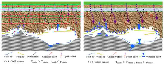 In the warm season (Figure 8b), T inside < T outside, ρ inside > ρ outside, warm air outside the cave flowed into the cave from the cave roof, moist air frequently flowed out of the cave and was cooled as it approached the entrance. This created a pocket of cool, dense air that partially blocked the airflow out of the cave entrance. Because the deep interior cave temperature was near-constant, air from the interior maintained this uniform temperature in the entrance when the air was blowing out of the cave. Likewise, the high relative humidity resulted from air moving from the interior of the cave [54]. Diurnal monitoring (Figure 5a,b) also showed that the cave temperature and relative humidity were greater in the warm season, and the abrupt change phenomenon occurred more strongly in the warm season than in the cold season. Owing to the limitation of the cave structure, the frequent intersection of airflow inside and outside the cave mainly occurred in the near-cave section; therefore, the closer the cave entrance, the more apparent the sudden change fluctuation (#2 > #4 > #9).