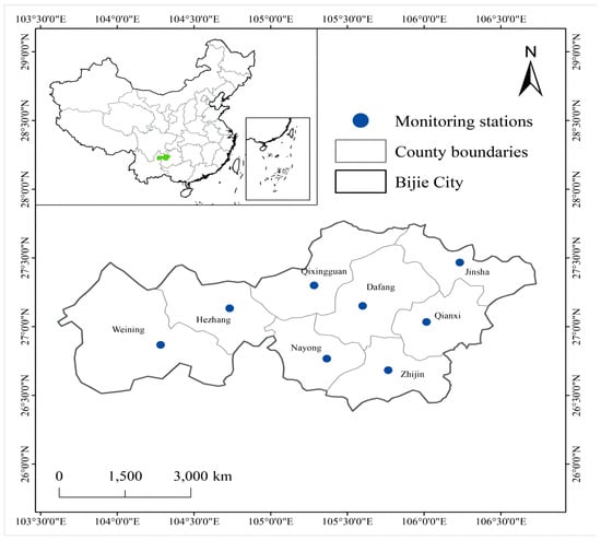 There are eight pollutant monitoring stations in Bijie District; they are located in Qixingguan District, Dafang County, Qianxi County, Jinsha County, Zhijin County, Nayong County, Weining Yi Autonomous County, and Hezhang County. Each region has a monitoring station, so the average data of the eight regional monitoring stations were selected as the experimental data. The study area and site distribution are shown in Figure 1.