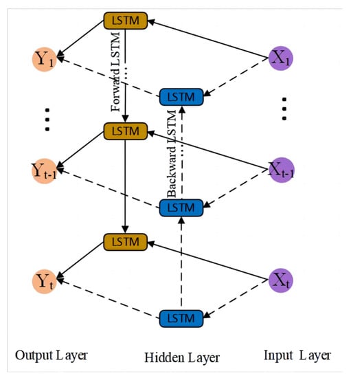 The bi-directional long short-term memory network (BILSTM) is a time-based two-way cyclic network that is trained through the forward time series and the reverse time series. The output data contains information on the entire time series []. The BILSTM network is a kind of neural network that is proposed to solve the problem because the long short-term memory network (LSTM) lacks the connection between the front and back data. In essence, the BILSTM network and LSTM network belong to the RNN.