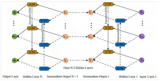 Suppose the th sequence of the DBiLSTM network input is xi = [x1, x2, …xn, xm]; then, the output of the first layer can be expressed as