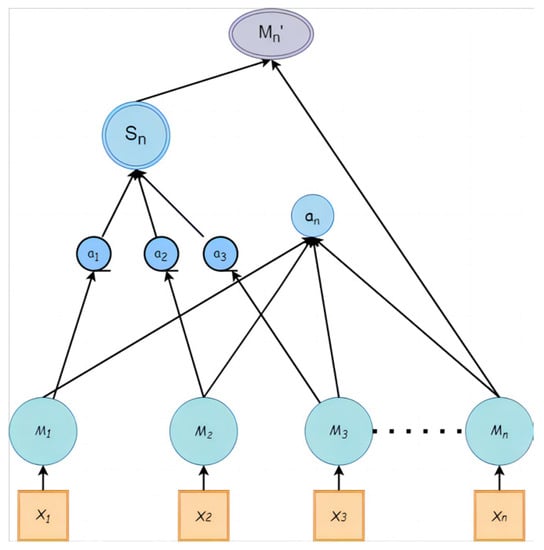 An attention mechanism is a special structure embedded in a machine-learning model and has a large number of applications in many fields. Its essence is that a reasonable distribution model reduces or ignores irrelevant information about the target information and enlarges the important information needed []. The attention mechanism mainly causes the model to assign different weight parameters to the input feature vectors in order to adjust the proportion of the input features, highlight the important influence feature vectors, suppress the useless feature vectors, optimize model learning, and make better choices, while not increasing the calculation amount of the model. The structure is shown in Figure 7.