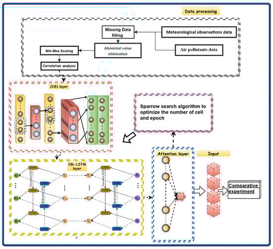 First, a deep bidirectional short-term memory network was established. On the basis of LSTM, the reverse LSTM layer was added, and the bi-directional long short-term memory (BiLSTM) was established. The deep bi-directional long short-term memory (DBiLSTM) was formed by using a multi-layered BiLSTM. Then, a convolutional neural network (CNN) consisting of two convolutional layers, two pooling layers, and two fully connected layers was established to improve the utilization of the feature data. The introduction of an attention mechanism, by mapping weights and learning parameter matrices, reveals the hidden states of different DBILSTM weights to capture important features of long time-series data and enhance the impact of key information. Aiming at the problem of local optimization in the selection of model network parameters, the sparrow search algorithm was used to train the model parameters, improve the prediction accuracy of the model, and finally output the prediction results. The whole process and model structure were as follows (Figure 8):