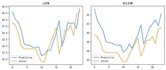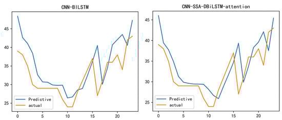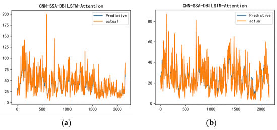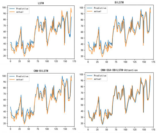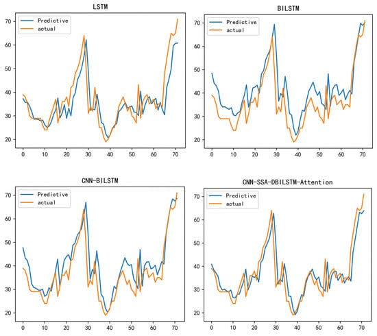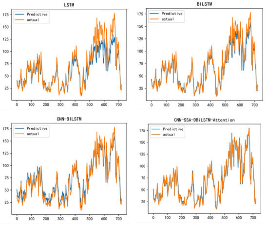 In order to study the visible prediction performance of the proposed hybrid model, the prediction results of Bijie City after 24 h, 48 h, 168 h, and 720 h were analyzed using a CNN-SSA-BILSTM-attention model and compared with three basic models, CNN-BILSTM-attention, LSTM, and BILSTM. CNN-SSA-BILSTM-attention shows good prediction results at 24 h, 72 h, 168 h, and 720 h. We forecasted and compared the 2021 winter data. The reason we used the winter data from 2021 was that PM2.5 fluctuated greatly during this period, and the difference between the lowest concentration value and the highest concentration value exceeded 60—this requires a model with a high prediction accuracy.