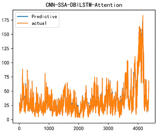 In order to better verify the accuracy of the model for long-time-span prediction, this paper used the CNN-SSA-DBiLSTM-attention model to predict PM2.5 concentration after half a year. The prediction results are shown in Figure 13. It can be seen from the figure that the predicted value and true value almost completely fit; RMSE is 6.20, MAPE is 11.93, MAE is 4.08, and R2 is 0.96. Compared with the short-term PM2.5 prediction results, the prediction accuracy of PM2.5 over a time span of six months remains stable. The coefficient of determination is 0.96. This indicates that the model proposed in this article has better prediction accuracy for long-term span prediction.
