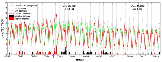 An estimate of the radius of the earthquake preparation zone [57] gives RD = 100.43M = 100.43×8.2 = R0 ≅ 3300 km. Measurements of the vertical component of the electric field on the ground surface within the area of preparation of this earthquake were not carried out. However, from the GIM TEC variations over the epicenter of the earthquake (Figure 1) we can conclude that some perturbation started to develop within the time interval of 12–13 UT (1–2 h LT) 27.07.2021 (see purple arrow in Figure 1) in extremely low geomagnetic conditions which lasted almost 5 days. From 00 h UT on 23 July 2021 to 19 h UT 27 July 2021, the geophysical index magnitude was Kp ≤ 1+, DST ≥ −10 nT, −3 nT ≤ IMF Bz ≤ 3 nT according to the Goddard Space Flight Center, NASA, USA (https://omniweb.gsfc.nasa.gov/form/dx1.html, accessed on 10 February 2023).
