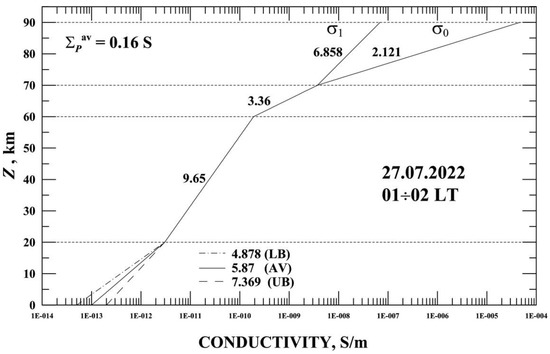 For this geographical point and the specified time interval 27 July 2021, the values of the corresponding parameters (as an average between 12 and 13 UT) of conductivity are σ0(z = 90 km) = 4.64910−5·S/m, σ1(z = 90 km) = 6.90210−8·S/m, ΣPav = 0.16 S. These required input parameters were calculated using empirical models of the IRI-2016 ionosphere (https://ccmc.gsfc.nasa.gov/modelweb/models/iri2016_vitmo.php accessed on 15 March 2023), and neutral atmosphere NRLMSIS-00 (https://modelweb.gsfc.nasa.gov/atmos/nrlmsise00.html accessed on 15 March 2023).