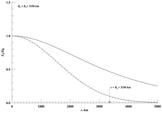 This distribution fits well with long-term measurements of seismogenic anomalies ΔEz before earthquakes in their epicentral regions, according to studies presented in [39]. From study [29], it follows that the value of E0 ≅ 1 kV/m at the ground surface, according to the measurements of [39], is achieved already before earthquakes with M within the range 4.1–4.7, and before an earthquake with M = 6.0, the value of E0 is ≅ 1.3–2.4 kV/m, while the value of the ratio RE/R0 lies within the interval [0.6–1.75]. Moreover, the study [42] described a seismogenic anomaly ΔEz on the ground surface, which appeared ~14 h before the earthquake of 12 June 2010 in the area of the Nicobar Islands (India) with a magnitude of M = 7.5 according to the updated data of the USGS catalog (https://earthquake.usgs.gov/earthquakes/browse/significant.php?year=2010 accessed on 15 March 2023), which existed for ~41 min. It had an amplitude of ΔEz = 1385 V/m at an epicentral distance Re = 1763 km. An estimate of the value of E0 for this earthquake (at its epicenter) made in [29] gives E0 ≅ 2.9–3.9 kV/m. In Figure 3, a solid line shows the normalized distribution of Ez/E0 on the ground surface depending on r for the case we are considering, when R0 = RE = RD ≅ 3350 km according to Formula (4). The dash-dotted line shows the corresponding distribution of the seismogenic field on the ground surface, which was used [36] according to the formula ΔEz = E0 exp[−(r/R0)2 ln10], derived from general considerations, for the same values of R0.