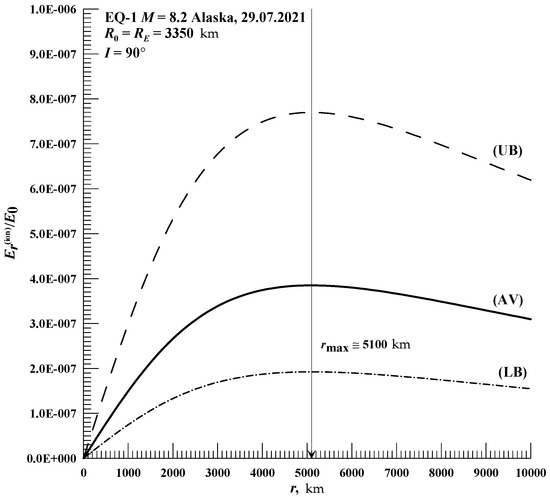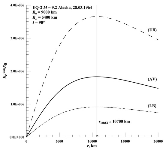 From the figure, it can be seen that the ratio Er(ion)/E0 reaches a maximum value at a distance rmax ≅ 10,700 km and is equal to 9.15 × 10−7 (LB), 1.83 × 10−6 (AV) and 3.66 × 10−6 (UB), respectively.