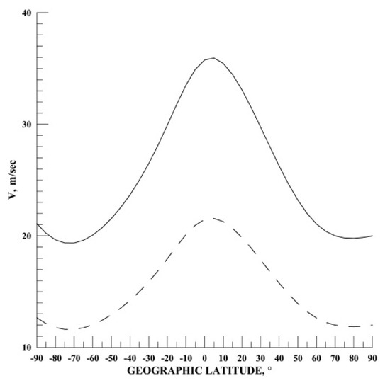 Figure 5 shows the latitudinal distribution of the module velocity electrodynamic drift of plasma V = |VE×B| = |E × B/B2| (m/s) at the geographical longitude of the epicenter of the earthquake EQ-1 (λe = 157.89° W ≅ 202° E) at altitude h = 300 km for |E⊥| ≅ Er(ion) = 1 mV/m (solid line) and 0.6 mV/m (dashed line). Here, E⊥ is perpendicular to the geomagnetic field line component of the electric field (for calculations, we use the International Geomagnetic Reference Field (IGRF-13) model (https://ccmc.gsfc.nasa.gov/modelweb/models/igrf_vitmo.php accessed on 15 March 2023)).