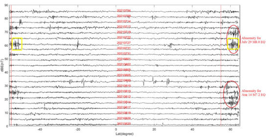 Yellow “squares” indicate abnormally high values of the amplitudes of ULF waves above the epicenter and at a magnetically conjugated point on the trajectory of the CSES satellite (sun-synchronous orbit, orbital height of 500 km, inclination of ~97.32°, period of 94.6 min) on 27 July 2021 two days before the ~EQ-1 earthquake. It is also visible that on 19 July 2021 the corresponding anomaly at the magnetically conjugated point is weakly expressed.