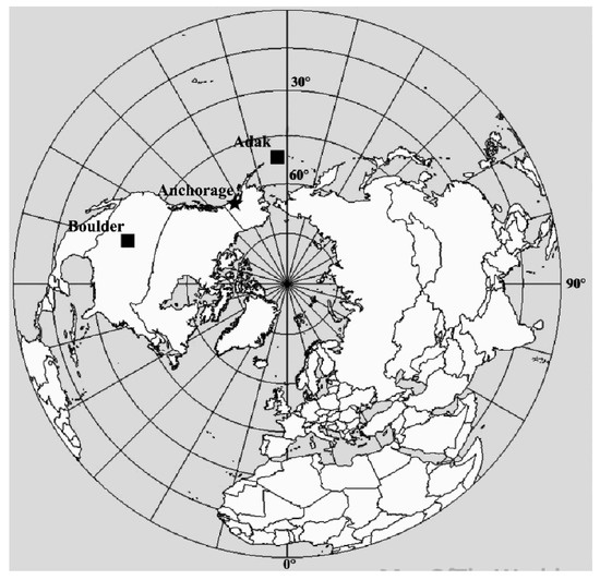 The geographical location of the ISVS Adak and Boulder and the position of the epicenter of the earthquake EQ-2. The epicenter of the earthquake is marked with an asterisk and almost coincides with the position of the ISVS Anchorage; other ISVSs are marked with black squares.