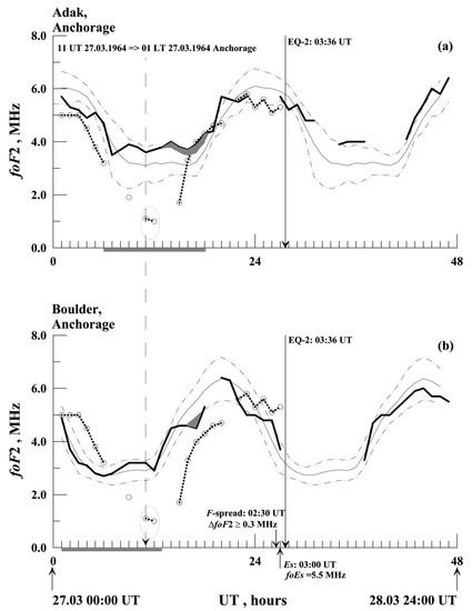 Critical frequency variations for the time interval 27–28 March 1964. (a) Adak (thick line) and Anchorage (open circles and dots); (b) Boulder (thick line) and Anchorage (open circles and dots). Thin solid lines show the corresponding monthly medians foF2med, and the dashed ones show the boundaries foF2med ± 0.75∙IQR (here IQR is the interquartile range). The thin long vertical lines with arrows indicate the moment of the EQ-2 earthquake, and the vertical dashed line with an arrow ending marks time 11:00 h UT on 27 March 1964, when a significant decrease in the current foF2 values starts on the records of Anchorage ISVS at local night hours (marked with ellipses on both panels). Solid dark thick bars under the abscissa axes mark local time intervals from 18 to 6 h LT (night-time). Breaks on the data curves mean an absence of data. Short arrows at the abscissa axis of the panel (b) mark the time when in [69] anomalies were reported in the ionosphere at Boulder ISVS: F-spread (arrow from above) and a powerful sporadic layer Es (arrow from below). The intervals when current values of foF2 exceed the boundaries of foF2med ± 0.75∙IQR are shaded [68].