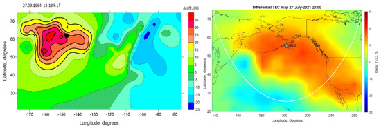 Left panel—differential LT map of the ∆foF2 (%) distribution based on Alouette-1 topside sounder data [69] for day-time passes of the satellite on 27 March 1964. Black circle—EQ-2 epicenter location; right panel—differential GIM TEC map for local day-time hours on 27 July 2021. Asterisk corresponds to the EQ-1 epicenter location. White line—Dobrovolsky earthquake preparation zone boundary.