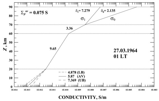 Suppose here (as well as earlier in Section 2) that at 11–12 h UT (03–04 h LT, night near the epicentral point close to the ISVS Anchorage) on 27 March 1964, i.e., 15.5–16.5 h before the earthquake, there was a seismogenic anomaly of the vertical electric field ΔEz at the ground surface. Let us then make the same assessment of a possible seismogenic electric field in the ionosphere according to the scheme described above in Section 2, omitting the details.