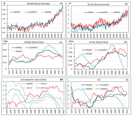 We wished to compare the models’ simulated AA with each other and with the AA derived from the observed temperatures within a time period of accelerated global warming. The global mean temperature anomalies with respect to the 1961–1990 mean, determined from the observed HadCRUT5.0 temperature data and from the CESM1 and CSEM2 [23,24,25] simulated temperatures, are shown in Figure 1a. Although there were considerable differences in the early part of temperature record, our main interest was in the time period post 1960. After 1990, the slope of the CESM2 simulated temperature anomaly was considerably steeper than that of the CESM1 simulation, as well as that of the observed temperature. This led to a higher CESM2 simulated temperature, especially during the early years of the 21st century.