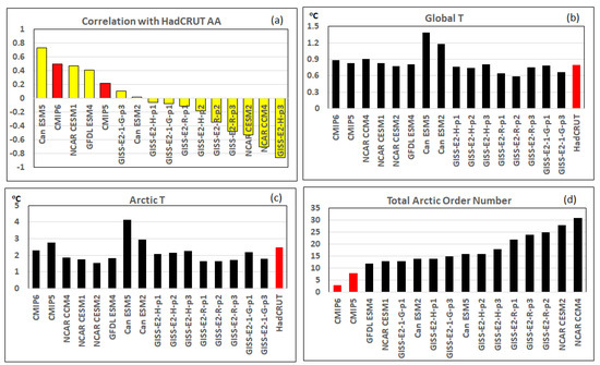 (a) Correlation coefficients between the Arctic amplifications deduced from the temperature anomalies simulated by the 14 North American CMIP6 climate models (yellow color) and the AA deduced from the observed (HadCRUT) temperature anomalies. The correlation coefficients are also shown for the ensemble mean temperatures of CMIP6 and CMIP5 models (red color). (b) Global warming between decades 1970–1980 and 2010–2020 by individual models (black color), CMIP6 and CMIP5 ensemble means, and the HadCRUT data (red colomn). (c) The same for the Arctic warming. (d) The total order number (defined in the text) of the 14 considered models (black color) and the CMIP6 and CMIP5 ensemble means (red color).