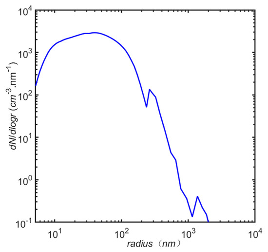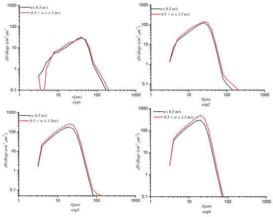 The average aerosol number concentration size distribution obtained in 2011 (Figure 2) [28] was used in the control experiment. The total number concentration was 2790 cm−3 (exp3). Then, with the shape of the spectrum unchanged, Na in each bin of the other schemes was obtained by multiplying Na of each bin in exp3 by a certain number of times (0.1 to 3.5). Eighteen experimental schemes were presented to explore the dependence of ε or Nc on w and Na, and the distribution of w with height and time derived from the results of the eighteen simulations. Exp1, exp2, exp3, and exp4 were used to analyze the characteristics of the cloud droplet number concentration size distribution with changes in Na. These were designed as follows: