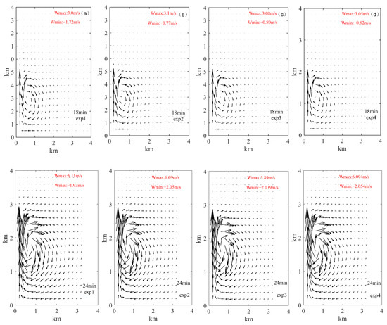 To avoid entrainment and mixing influences, the region of strong updraft in the center of the clouds must be taken as the research domain. In this study, the spatial distributions of the wind fields correspond to the aforementioned aerosol schemes, as illustrated in Figure 3. The wind fields are represented by wind vectors (the black arrows). For example, in the same aerosol scheme, the maximum values of w first increases and then decreases with time. It is more than 3 m/s at the 18th minute, more than 7 m/s at the 30th minute, and more than 1 m/s at the 38th minute. The heights corresponding to the maximum values of w increase with time. For example, the height is below 2 km in the 18th minute but above 2 km in the 30th minute. The domain field is within the radial distance of 0.2 km, where the strong center of w is located.