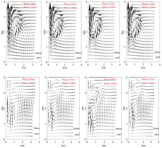 The wind fields for the different schemes for (a) exp1, (b) exp2, (c) exp3, and (d) exp4.