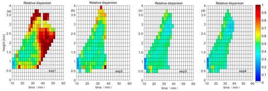Temporal and height distributions of ε in the domain field for (a) exp1, (b) exp2, (c) exp3, and (d) exp4.