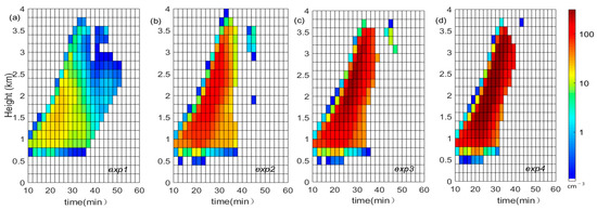 The distribution of LWC with height and time in the domain field: (a) exp1, (b) exp2, (c) exp3, and (d) exp4.