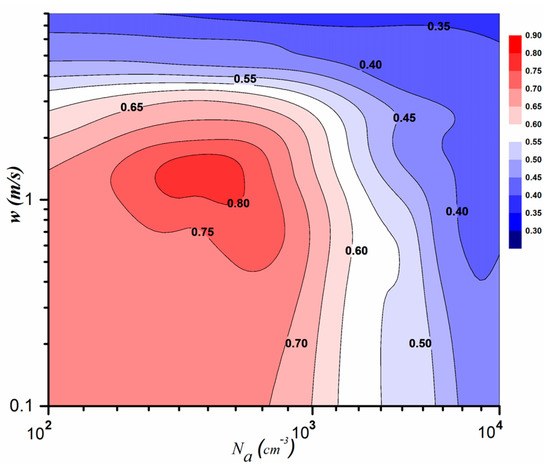 Figure 7 shows the dependence of ε on w and Na during the collision–coalescence stage. When Na is fixed, ε increases slowly and then decreases rapidly with increasing w. In addition, in the regime where w is smaller than 1.5 m/s, ε mainly decreases with increasing Na, but it changes slowly or remains unchanged with changing w. Therefore, this regime is the aerosol main influence regime. Furthermore, where w is greater than 3 m/s, ε decreases slowly with Na but decreases strongly with increasing w, so this regime is the w main influence regime. When w is between 1.5 m/s and 3 m/s, ε also decreases with w, but first increases and then decreases with Na, so this regime is the joint influence regime.