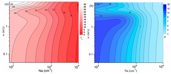 Joint dependence of aerosol number concentration and updraft velocity on the (a) average cloud droplet radius (μm, shading) and (b) standard deviation (μm, shading).