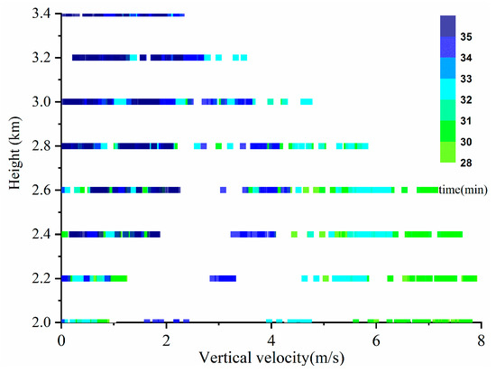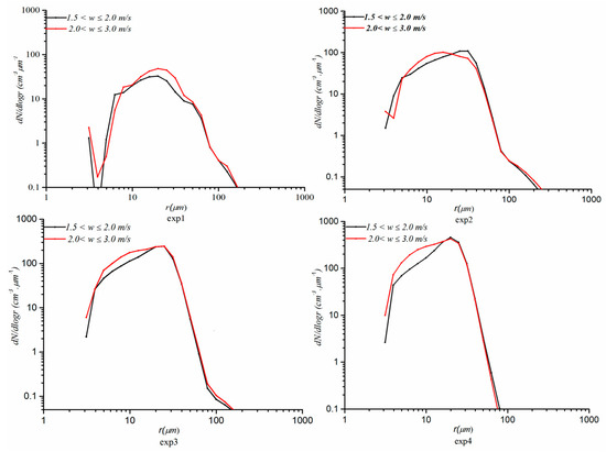 In the joint influence regime (1.5 ≤ w ˂ 3 m/s), as shown in Figure 10, 4–30 μm droplets increase, but the large cloud droplet concentration changes little with the increase in w, so the CDNCS becomes narrower (i.e., σ becomes smaller) with increasing w due to the explosion of smaller droplets. As shown in Figure 12, w values between 1.5 m/s and 3 m/s occur after the 34th minute and above the height of 2.8 km during the later period of the collision–coalescence stage. At this time, the drag effect on w steadily increases [31], and some scholars have also found this feature, that is, above the maximum of w, w decreases [32,33]. Hence, the drag effect is enhanced with the decreasing w [31], and the evaporation of falling cloud droplets [31] significantly reduces the 4–30 μm cloud droplets (Figure 10), which widens the CDNCS (i.e., higher σ) and increases rc (Figure 8a,b).
