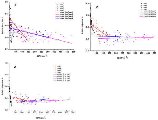 This study also analyzed the correlations between ε and Nc within the different main regimes. Under low w conditions (w ≤ 1.5 m/s), negative correlations are observed between ε and Nc, and the relationship becomes weaker with the increase in Na (Figure 13a). However, when w > 1.5 m/s, the negative correlations gradually weaken or even become positive correlations with Na (Figure 13b,c). The positive correlations are found at higher Na (exp3 or exp4).