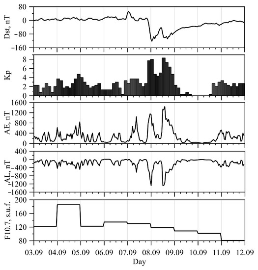 The geomagnetic storm of 7–8 September 2017 was preceded by a coronal mass ejection (CME) that reached the Earth around 23 UTC on 7 September. A strong geomagnetic storm began at 23:25 UTC. Figure 1 shows the behavior of the indices of geomagnetic (Dst, Kp, AE, AL) and solar (F10.7) activity on 3–11 September 2017 [https://omniweb.gsfc.nasa.gov] (accessed on 18 February 2022).