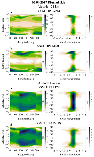 Spatial distribution of the amplitude of the diurnal tide in temperature and the spectrum of tidal waves at heights of 121 km (a,b) and 154 km (c,d) according to the results of calculations in the GSMTIP + APM (left) and GSMTIP + AIMOS (right) variants on a geomagnetically quiet day on 6 September 2017.